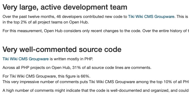 Il existe des développements spécifiques qui ne font pas partie du code et qui viennent d'être ajoutés à un projet ou un profil local. Un autre point intéressant et quelque peu différent de beaucoup de projets, Tiki est un projet "mangez votre propre nourriture" (dogfooding). | |